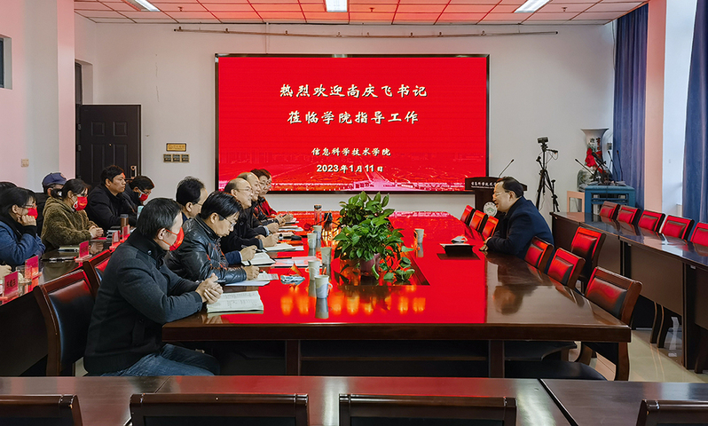 尚庆飞认真听取了学院近期工作情况汇报,充分肯定了学院近年来取得的成绩,表示对学院未来的发展充满信心。他指出,学院领导班子团结合作,教职工凝心聚力,全院师生精神饱满,各项工作井然有序,在人才培养、学科专业建设、国际交流与合作办学、科学研究和服务地方等学院重点工作均取得了较好成绩。就进一步推进学院高质量发展,他提出三点希望:一是要抢抓机遇,锚定目标,在信息与通信工程博士点学科建设和“新工科”专业建设中,选择突破口,提高核心竞争力;二是要加大高层次人才引进力度,提高自主创新能力,增强学院软硬实力;三是要加大加快“走出去、引进来”步伐,拓宽眼界,提升格局,激发学院发展新活力。他希望全院上下要紧盯学院发展目标任务,始终保持攻坚克难、锐意进取的干劲,始终保持昂扬向上、奋发有为的拼劲,始终保持敢为人先、开拓创新的闯劲,积极投入到学院各项工作中,以更多更优的成绩迎接学校第四次党代会的胜利召开。