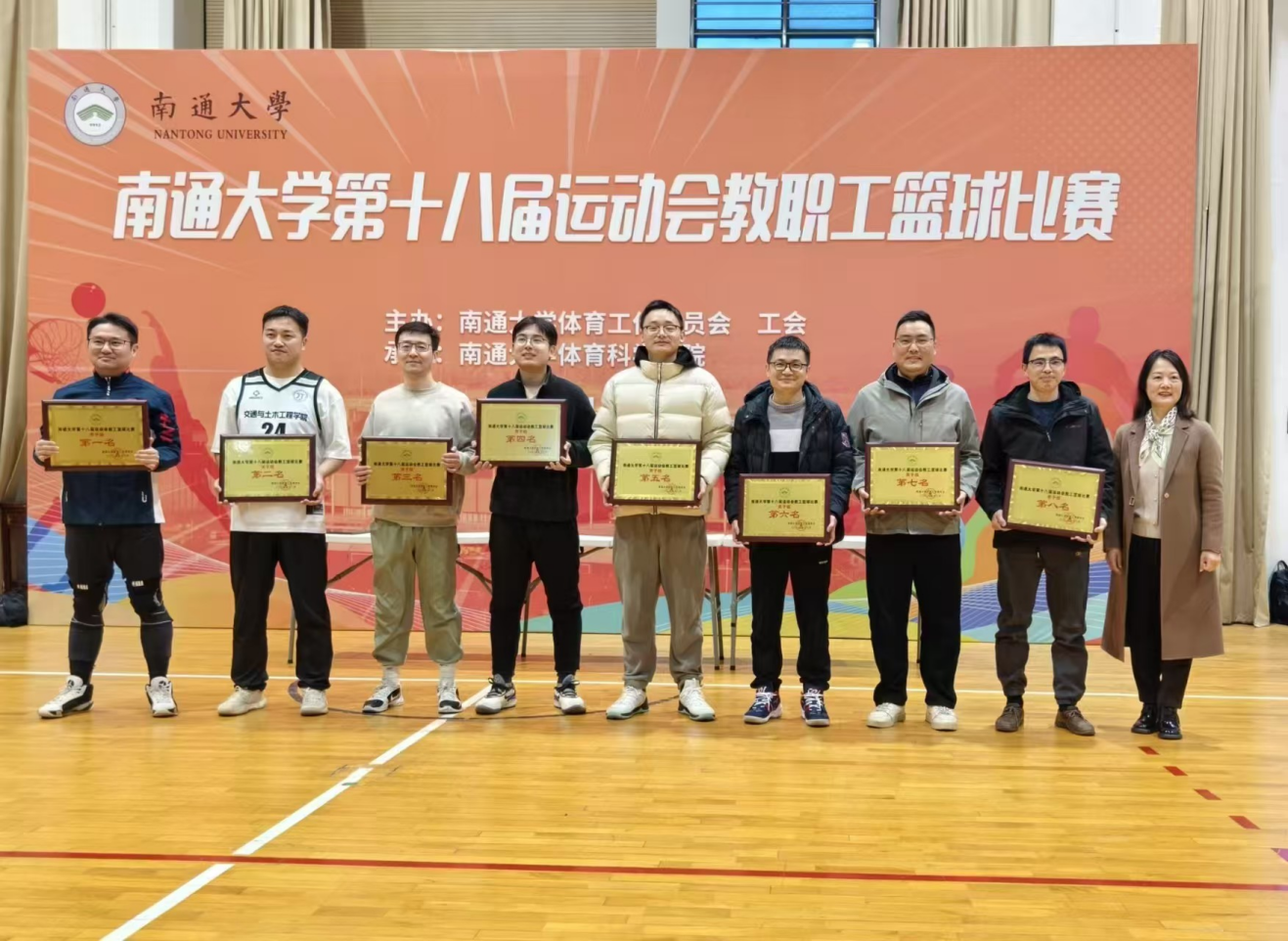 12月18日下午,我校第十八届运动会教职工篮球比赛在啬园校区体育教学训练馆落下帷幕。在为期十四天的比赛中,来自全校各基层单位的近四百名教职工参赛,经过激烈角逐,机关分工会男子二队和女子队包揽男、女组冠军,我院教职工篮球队获第五名。校工会主席徐宇红、体育科学学院(支云足球学院)党委书记刘军出席闭幕式并为获奖队伍颁奖。