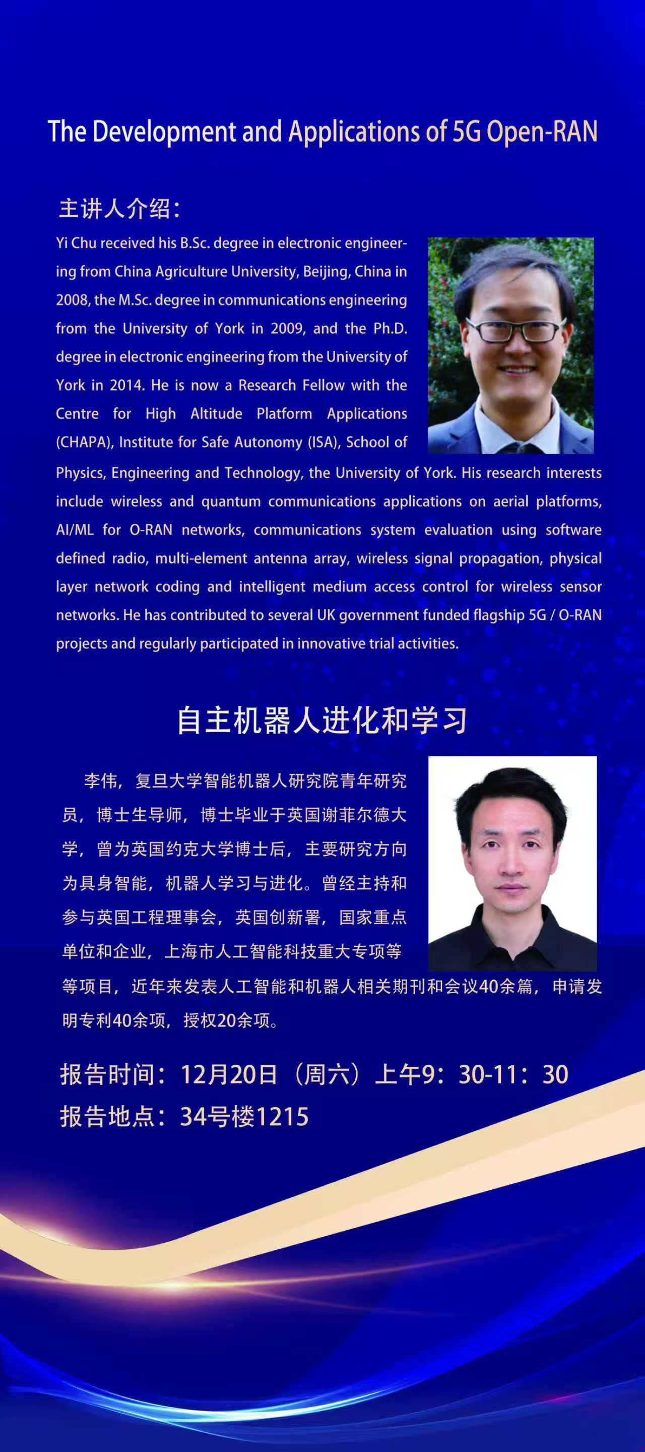 讲座预告:1. The Development and Applications of 5G Open-RAN;2. 自主机器人进化和学习