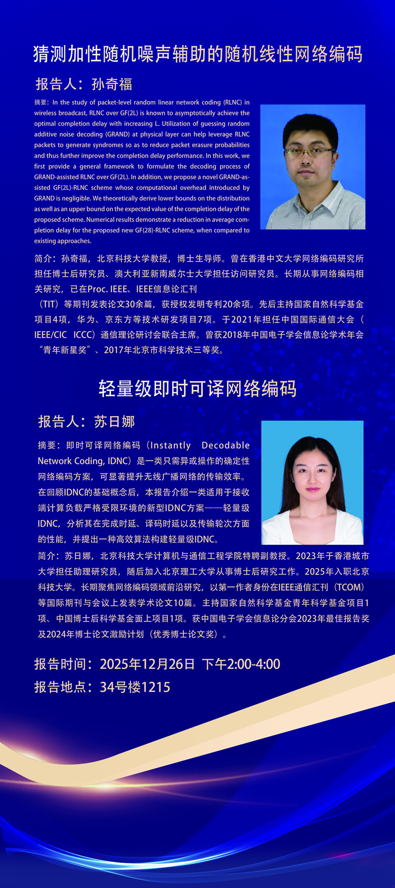 讲座预告:1.猜测加性随机噪声辅助的随机线性网络编码;2.轻量级即时可译网络编码